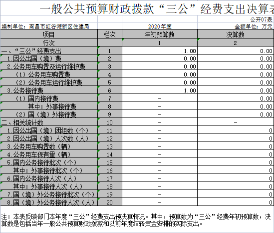 本部门2020年度一般公共预算财政拨款“三公”经费支出年初预算数为1万元,决算数为0万元,完成预算的0%,决算数较2019 年减少0.14万元,减少100%,其中: