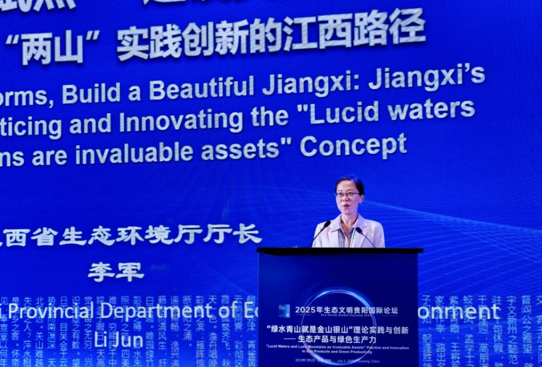 7月5日,2025年生态文明贵阳国际论坛开幕式在贵阳市隆重举行。江西省生态环境厅厅长李军受邀参加“两山”理论实践与创新主题论坛,并作题为《深化改革试点 建设美丽江西》的经验交流。