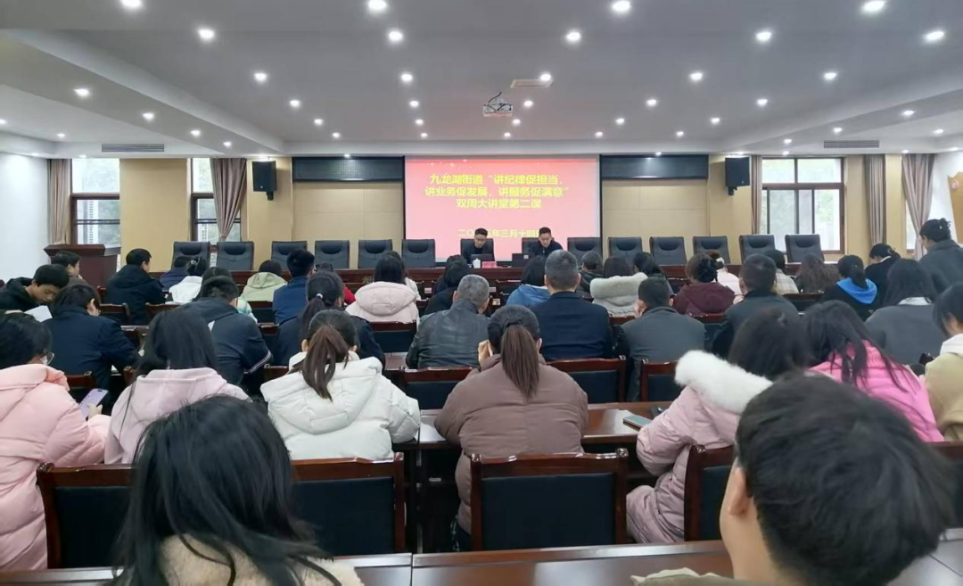 为深入贯彻落实全面从严治党要求,以全街道村(站)干部“纪法意识大转变 业务能力大提升 作风水平大改进”专题培训班为契机,九龙湖街道为进一步推动纪法知识和业务培训常态化,特开设纪法知识和业务培训双周大讲堂,由各部门针对日常工作中存在的短板和弱项开展相应培训,每两周开展一次,引导党员干部“讲纪律促担当,讲业务促发展,讲服务促满意”。