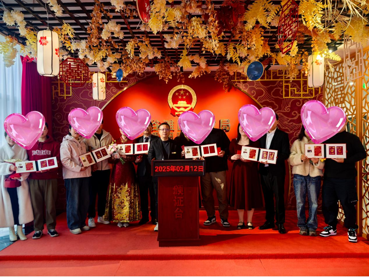 元宵节自古以来便是团圆与爱情的象征,选择在这样一个特殊的日子里喜结连理,无疑为新人们的婚姻生活增添了更多的甜蜜与幸福。婚姻登记处为此精心布置颁证厅,营造出浓厚的节日氛围和满满的仪式感。