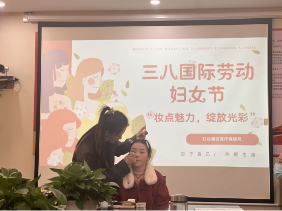 为庆祝第114个“三八”国际劳动妇女节,进一步丰富女性职工文化生活,展现新时代女性风采,3月7日下午,红谷滩区医保局组织开展“妆点魅力,绽放光彩”美妆教学活动,通过专业教学与互动体验,为全局女职工送上节日祝福,激发女性自信活力。